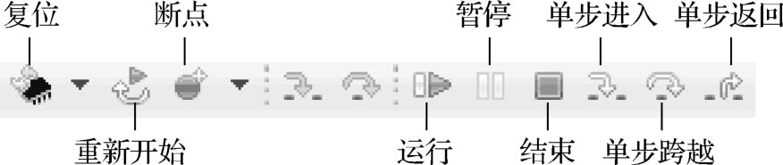 CCS调试界面主要包括调试工具栏、调试(Debug)视图、变量(Variables)/表达式(Expressions)/寄存器(Registers)视图、主程序(main.c)视图和控制台(Console)视图等,其中调试工具栏如图2.21所示。