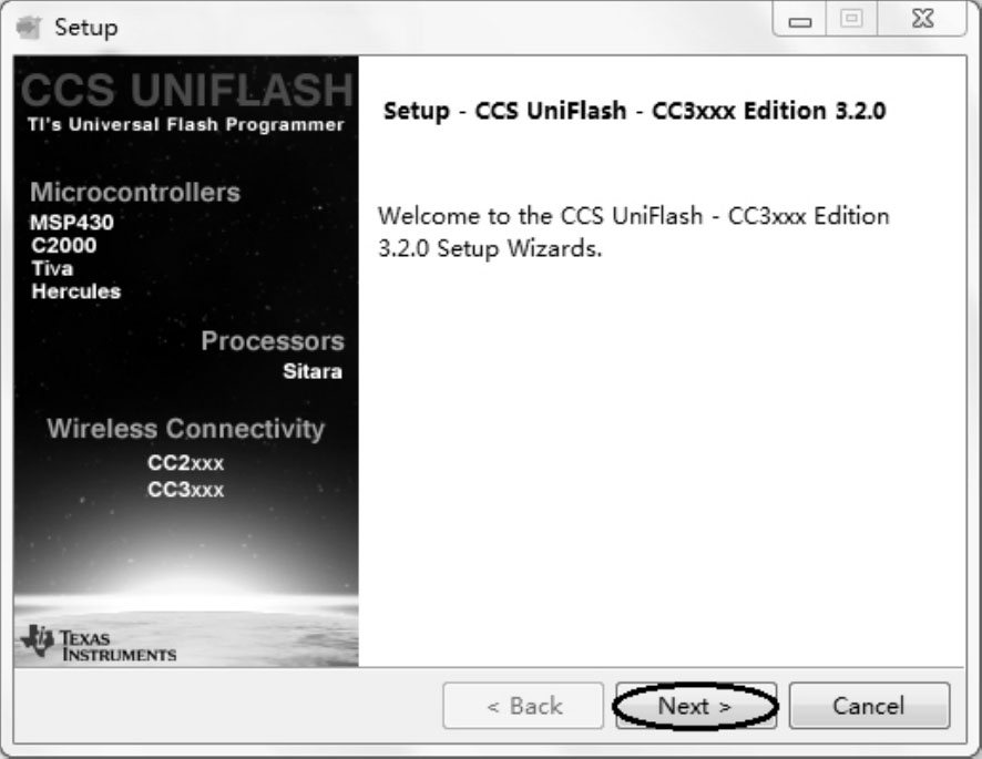 UniFlash用于将固件、应用程序和证书等编程到串行闪存。UniFlash v3.2的安装文件是“uniflash_cc3xxx_setup_3.2.0.00123.exe”,在Windows 7中的安装步骤如下。
