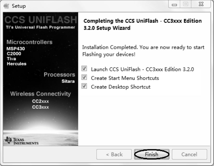 (5)单击“Finish”(完成),创建快捷方式,并执行UniFlash。