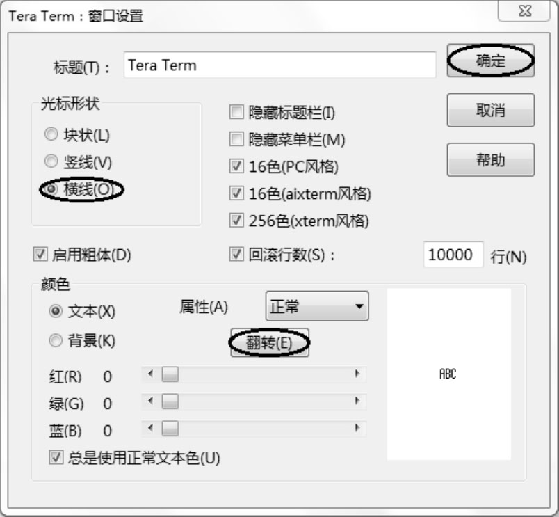 (13)选择“光标形状”为“横线”,单击“翻转”按钮,将黑底白字翻转为白底黑字,单击“确定”按钮关闭“窗口设置”对话框。