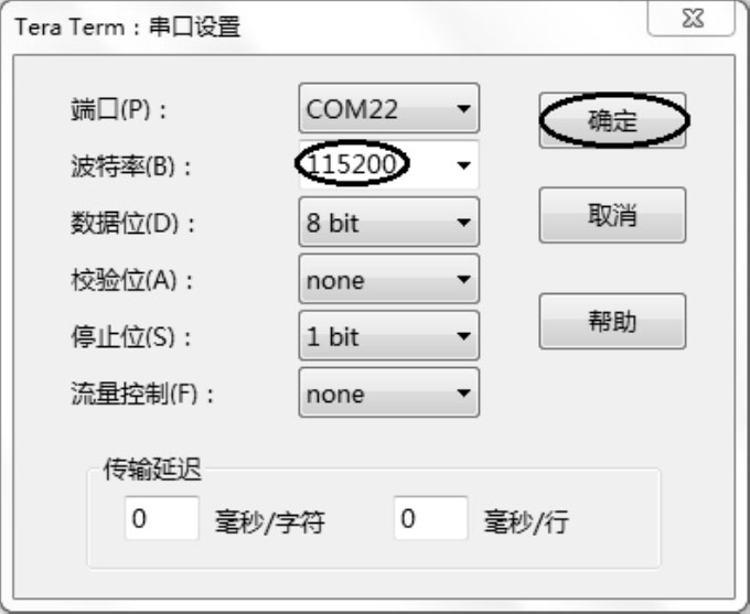 (17)选择“波特率”为115200,单击“确定”按钮关闭串口设置对话框。