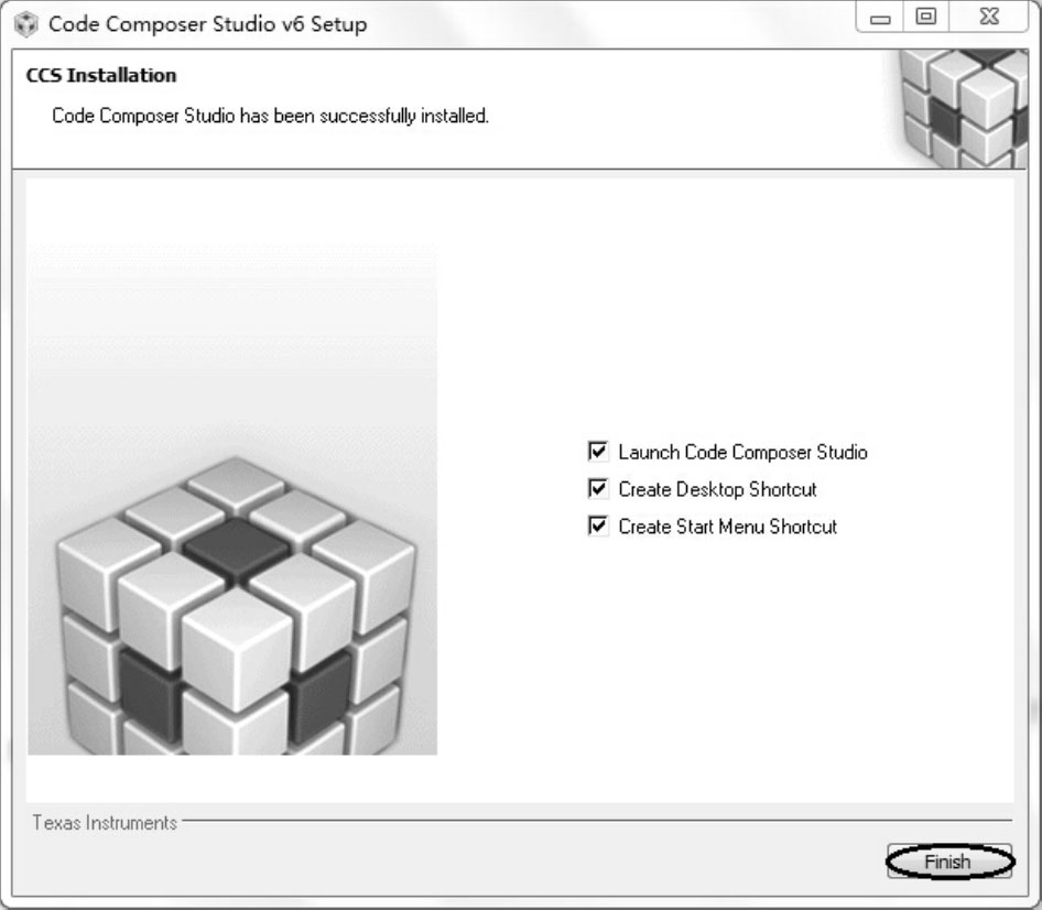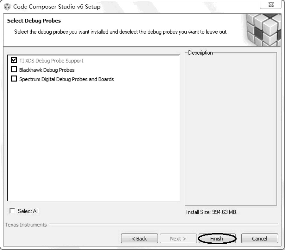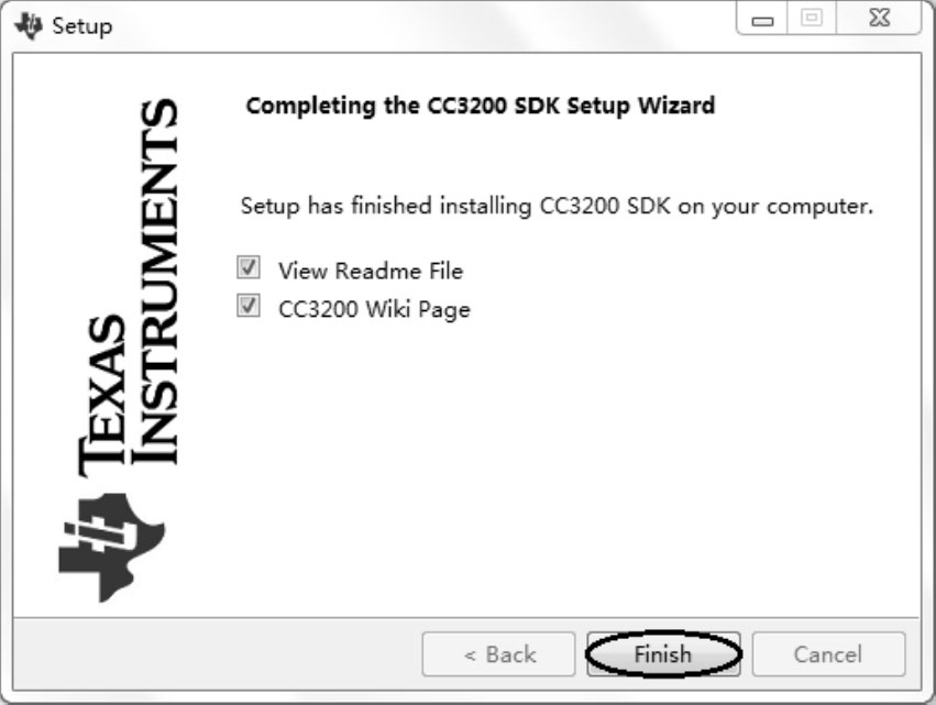 (4)接受默认安装目录或修改安装目录,单击“Next”(下一步)按钮两次,开始安装CC3200 SDK。安装完成后,显示如图2.4所示的对话框。