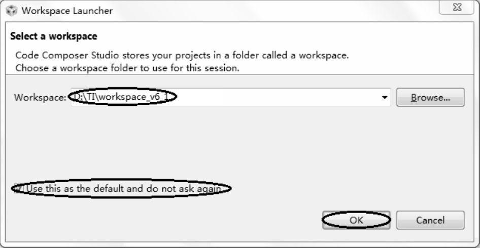 (6)单击“Finish”(完成)按钮完成安装,创建快捷方式并执行CCS,显示如图2.11所示的选择工作空间对话框。
