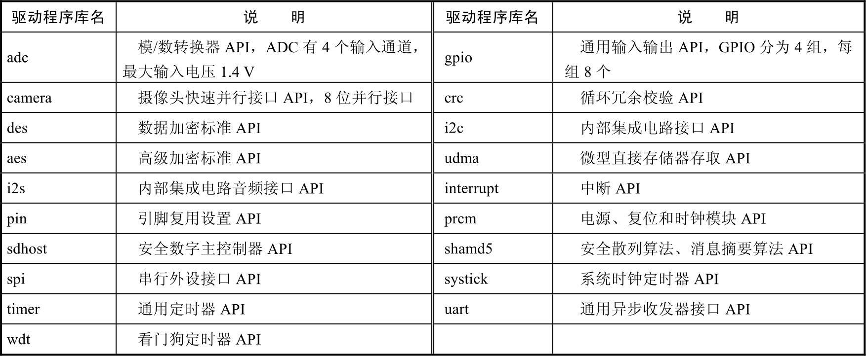 (1)外设驱动程序库。CC3200外设驱动程序库简要说明如表2.2所示。