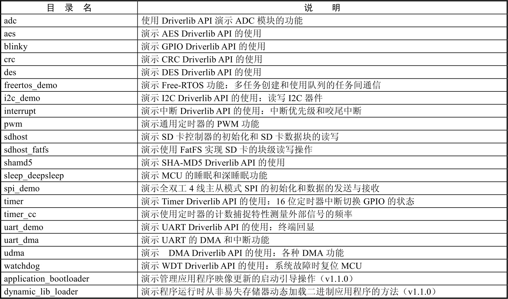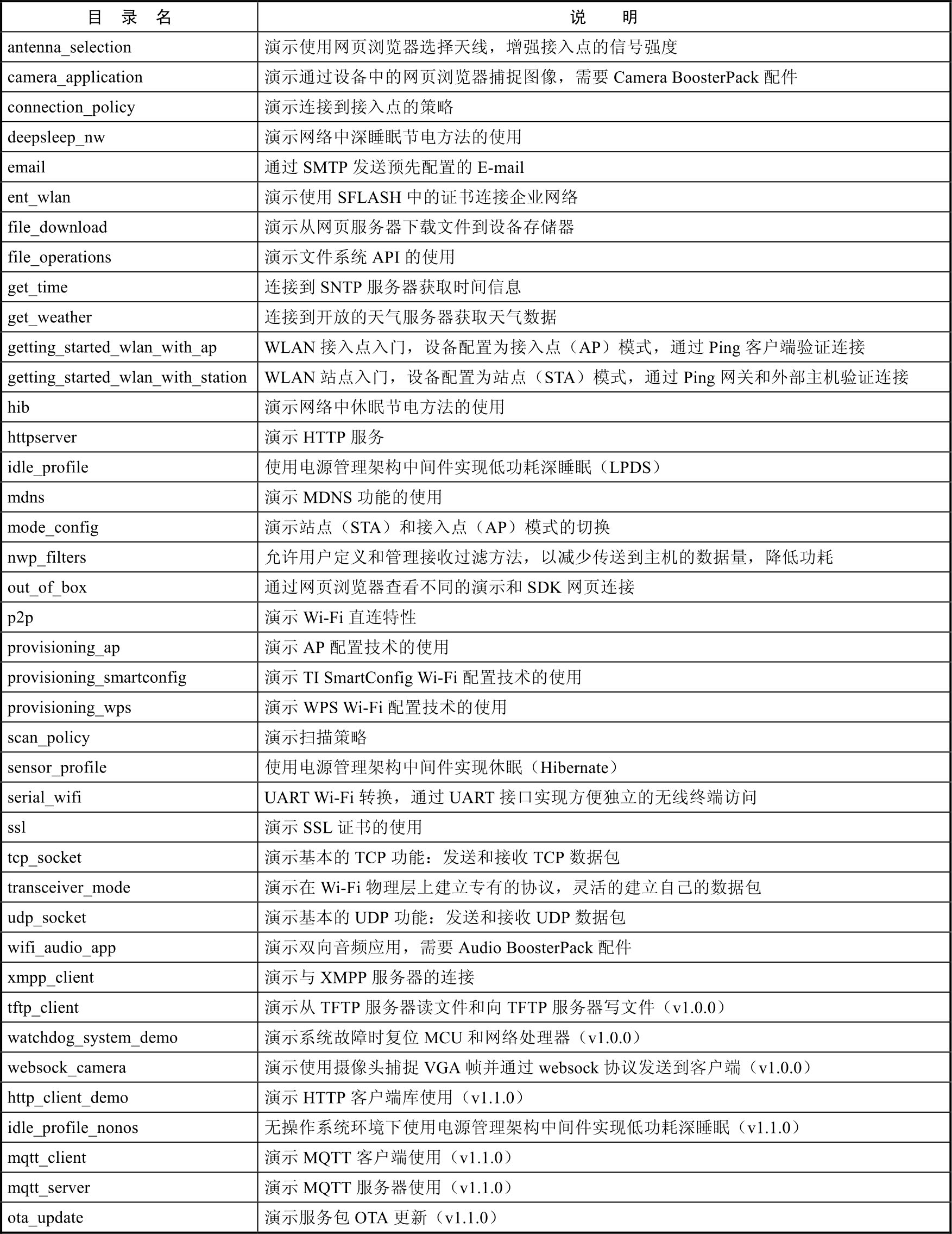 (4)示例程序。CC3200 SDK的example目录中包含62个示例程序目录,这些示例程序大致分为两类:22个MCU示例程序和40个网络示例程序,两类示例程序的目录名及其简要说明分别如表2.4和表2.5所示。