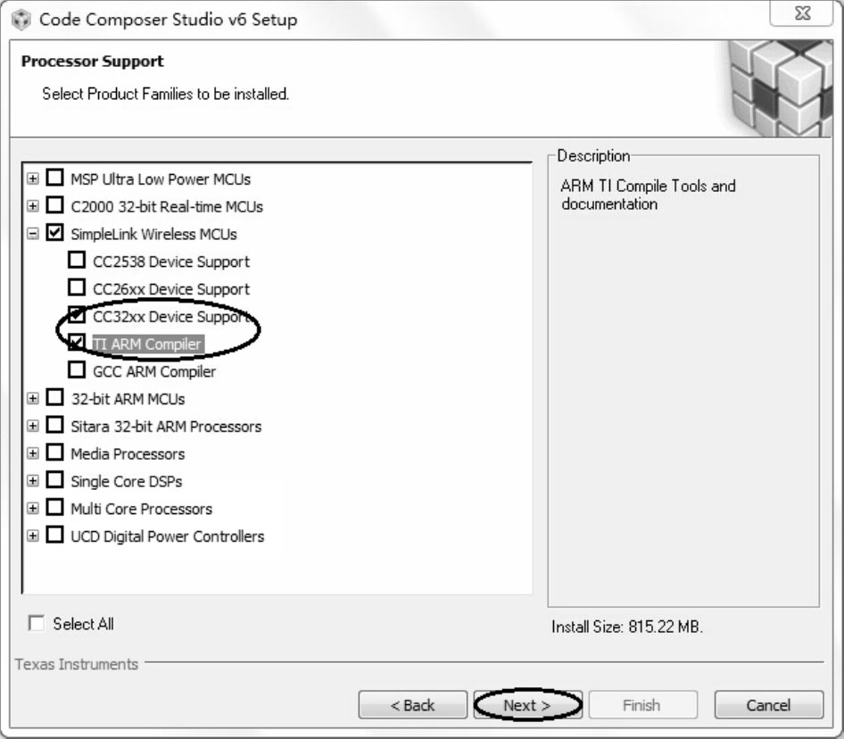 (4)选择“SimpleLink Wireless MCUs”下的“CC32xx Device Support”和“TI ARM Compiler”,单击“Next”(下一步)按钮,显示如图2.9所示的选择调试探头对话框。