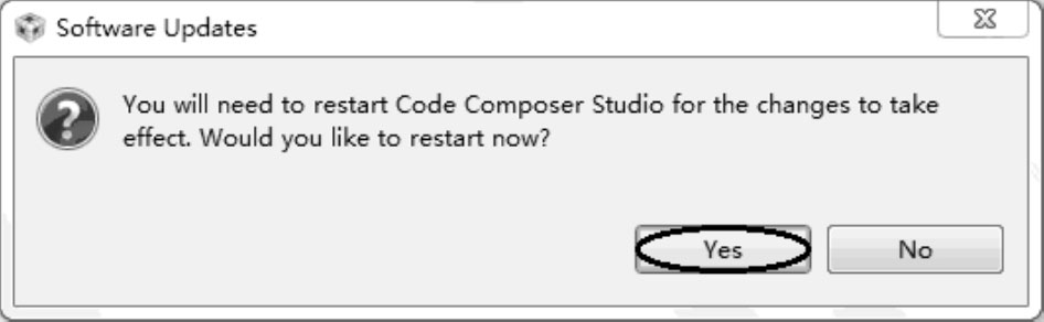 (10)安装完成后,显示“Software Updates”(软件更新)对话框,单击“Yes”(是)按钮重新启动CCS,如图2.14所示。