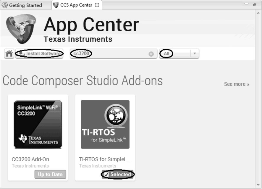(8)单击“Getting Started”(开始)标签右上角的“App Center”(应用中心),打开应用中心标签,在搜索框中输入“cc3200”,在搜索框右边的下拉菜单中选择“All”,搜索出“CC3200 Add-On”和“TI-RTOS for SimpleLink”插件,单击插件右下角的“Select”选中插件进行更新,如图2.13所示。