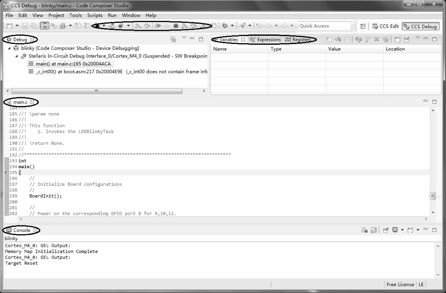 (4)用USB线将开发板连接到计算机,单击“Run”(运行)→“Debug”(调试)或按“F11”键,CCS将目标文件“blinky.out”下载到CC3200并进入调试界面,如图2.20所示。