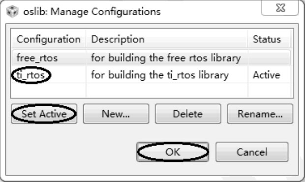 (6)重建oslib项目时,需首先在“属性”对话框中选择“Configuration”(配置)为ti_rtos,单击“Manage Configurations…”(管理配置)按钮打开管理配置对话框进行配置管理,如图2.23所示,然后在“main”标签选择“Compiler version”(编译器版本)为“TI v5.2.2”。