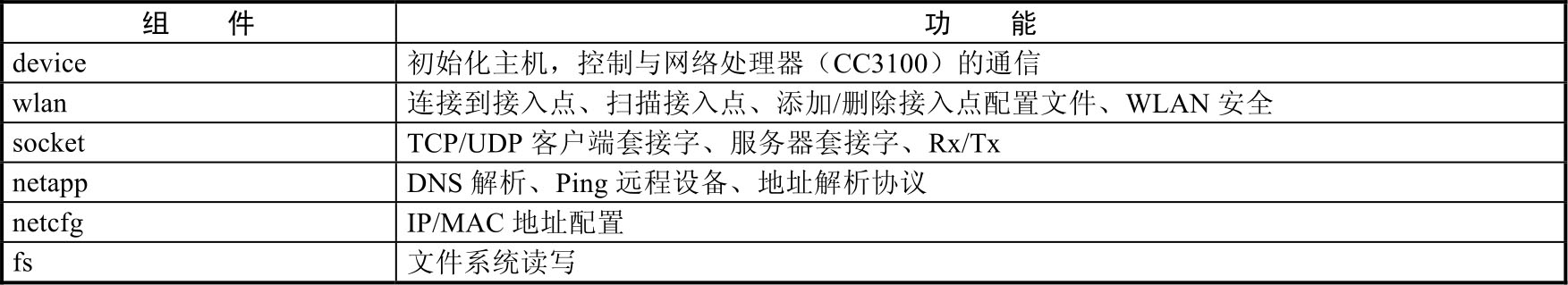 (2)网络驱动程序库。TI SimpleLink架构提供从基本设备管理到无线网络配置和BSD套接字服务等一系列功能,为了更好地进行设计,这些功能被分离成单独的模块,每个模块代表不同的SimpleLink架构功能。SimpleLink架构组件如表2.3所示。