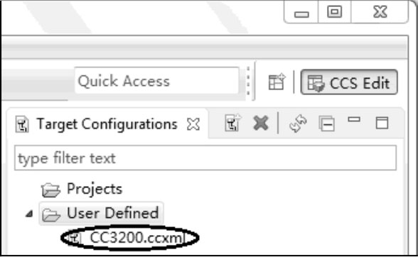 (2)右击“User Defined”(用户定义),在弹出菜单中单击“Import Target Configuration”(导入目标配置),选择“CC3200 SDK”安装目录“tools\ccs_patch”目录中的“CC3200.ccxml”文件,在“File Operation”(文件操作)对话框中单击“OK”按钮复制文件,“CC3200.ccxml”出现在“User Defined”(用户定义)下,如图2.19所示。