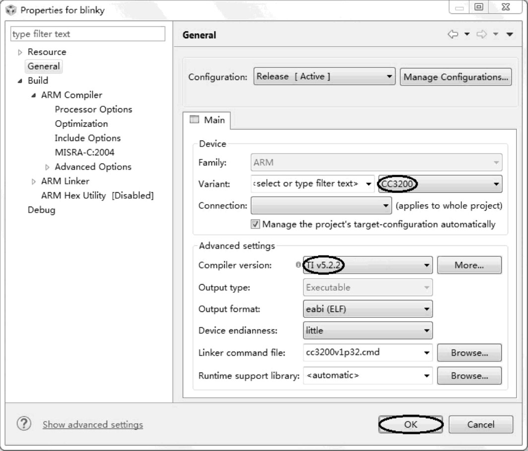 (3)右击“Project Explorer”(项目浏览器)中的“blinky”项目,在弹出菜单中单击“Properties”(属性),打开“属性”对话框,确认“Device”(器件)选择“CC3200”,选择“Compiler version”(编译器版本)为“TI v5.2.2”,如图2.17所示。
