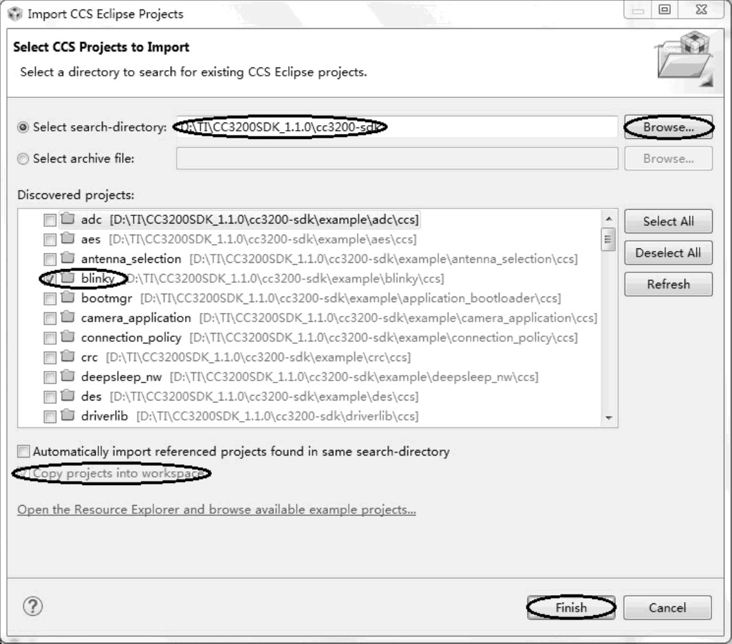 (2)单击“Browse”(浏览)按钮,选择CC3200 SDK安装目录,其中的CCS项目显示在“Discovered projects”(发现项目)下。