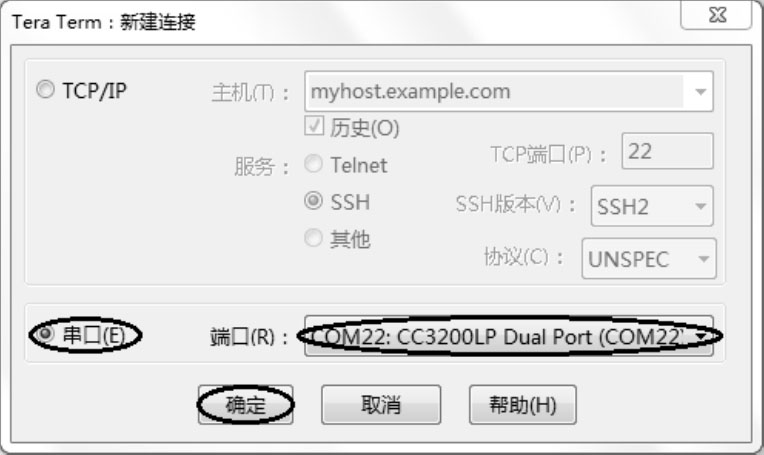 (11)单击“串口”,如果已将CC3200 LaunchPad等硬件开发平台连接到PC,并且正确安装了FTDI驱动程序,则“端口”下拉列表中会出现USB-UART转换后的串行端口(如COM22),选择该串行端口,单击“确定”按钮,显示Tera Term窗口。