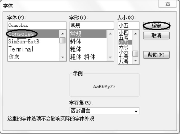 (15)选择“字体”为Consolas,单击“确定”按钮关闭字体对话框。