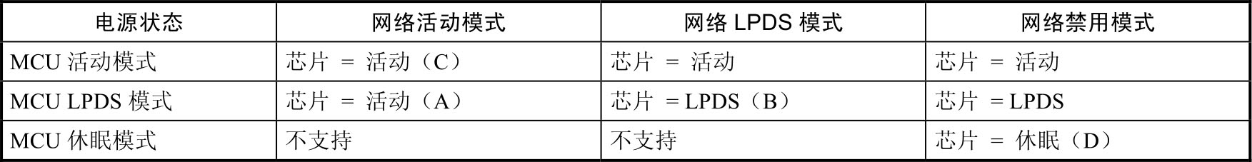 应用MCU和网络处理器(CC3100)的操作应确保设备大部分时间停留在最低功耗模式,以延长电池寿命。CC3200重要的片级电源模式如表1.3所示。