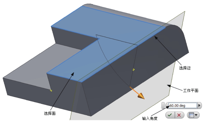 (7)平面绕边旋转角度 :选择一个平面和平行于该平面的一条边,创建一个与该平面成一定角度的工作平面,如图1-56所示。
