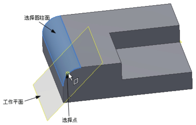 (4)与曲面相切且通过点 :选择一个圆柱面和一个点,则创建在该点处与圆柱面相切的工作平面,如图1-53所示。