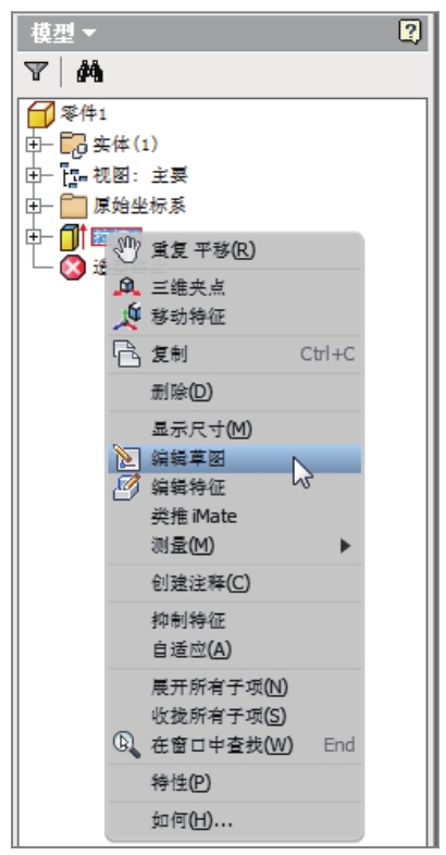 如果要在一个现有的零件图中进入草图环境,首先应该找到属于某个特征的曾经存在的草图(也称为退化的草图),选择该草图,单击右键,在打开菜单中选择“编辑草图”选项即可重新进入草图环境。如图2-5所示。当编辑某个特征的草图时,该特征会消失。