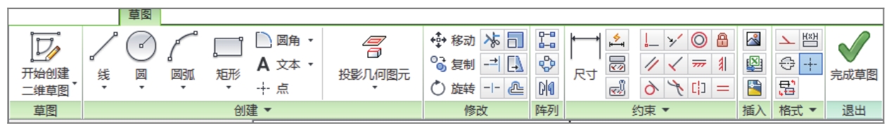 用户界面主要由ViewCube(绘图区右上部)、导航栏(绘图区右中部)、快速工具栏(上部)、功能区、浏览器(左部)和状态栏以及绘图区域构成。二维草图功能区如图2-4所示,草图绘图功能区包括绘图、约束、阵列和修改等面板,使用功能区比起使用工具栏效率会有所提高。