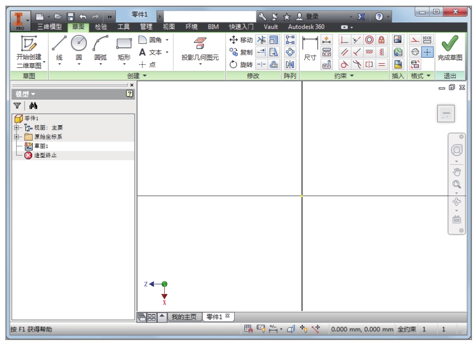新建一个零件文件,单击“草图”面板中的“开始创建二维草图”按钮