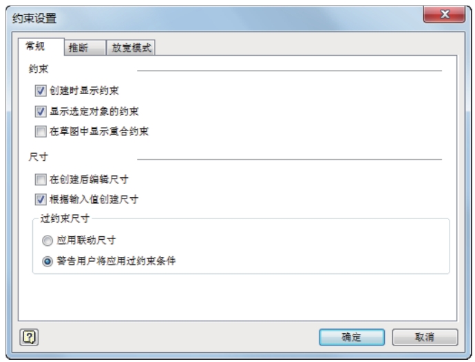 (1)约束设置:单击“设置”按钮,打开如图2-8所示的“约束设置”对话框,用于控制草图约束和尺寸标注的显示、创建、推断、放宽拖动和过约束的设置。