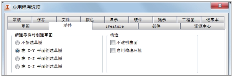 ,打开“应用程序选项”对话框,选择“零件”选项卡,在“新建零件时创建草图”选项中设置,选择“在 X-Y 平面创建草图”选项,如图 2-6 所示,所有的实体建模默认都是在 XY平面上创建草图。