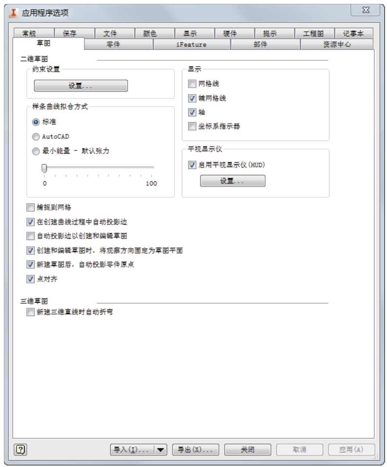 “应用程序选项”对话框中“草图”选项卡中的选项说明如下。