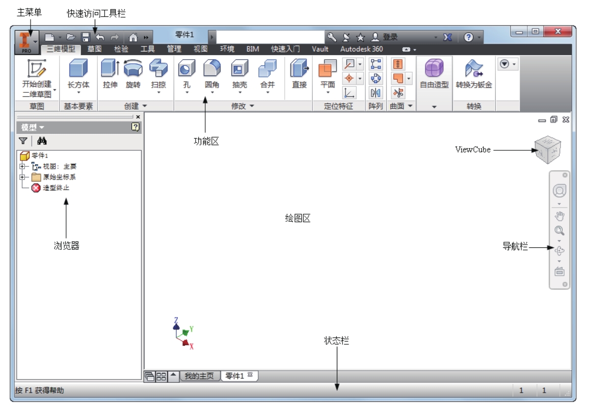 工作界面包括主菜单、快速工具栏、功能区、浏览器、ViewCube、导航栏和状态栏,如图1-3所示。