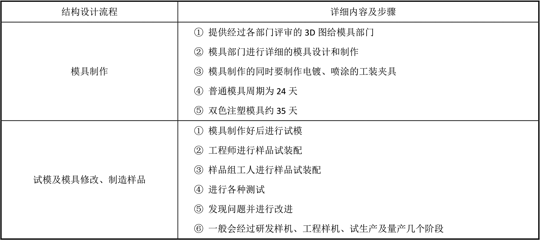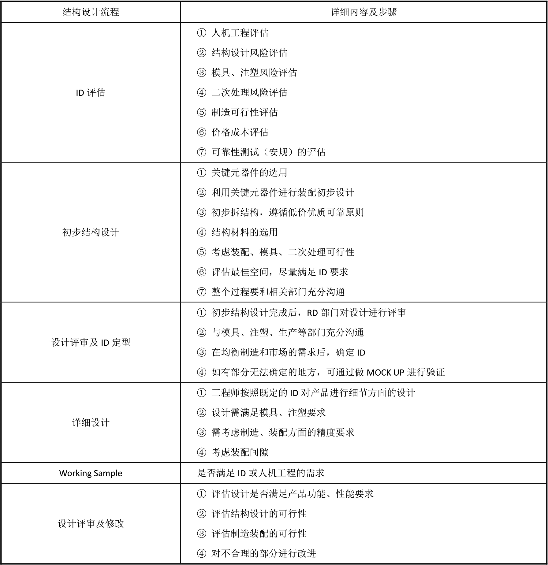 作为一名结构工程师,需要具备的知识点有结构设计、模具和注塑、常用的材料(塑胶和五金)、二次处理、生产装配、相关的产品知识和品质知识等。ID及结构设计的流程如表2-1所示。