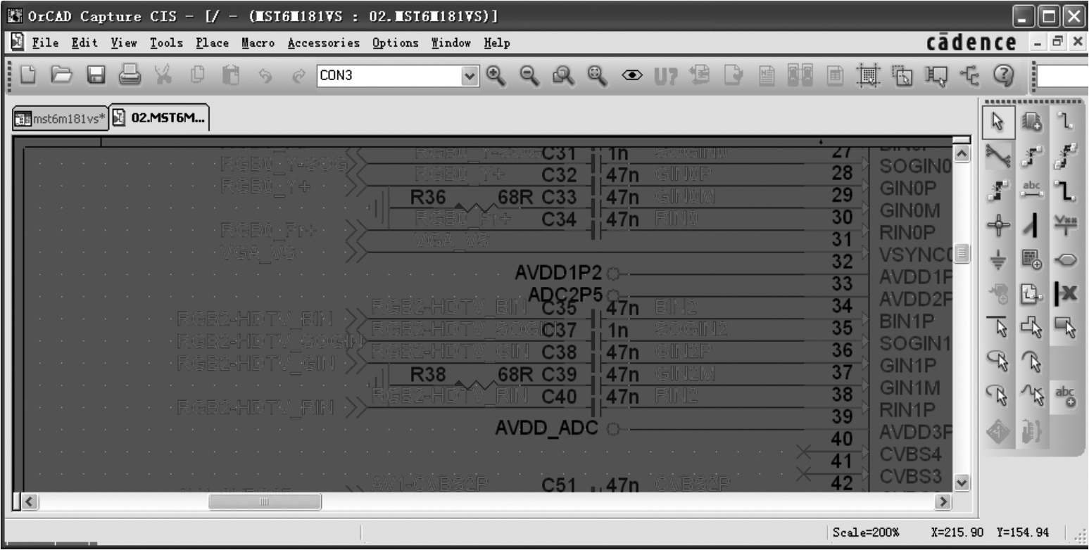 (1)OrCAD Capture CIS:OrCAD Capture(其界面如图2-56所示)是Cadence Allegro的原理图设计工具。OrCAD Capture作为行业标准的PCB原理图输入方式,是当今世界最流行的原理图输入工具之一,其具有简单直观的用户设计界面。OrCAD Capture提供了完整的、可调整的原理图设计方法,能够有效应用于PCB的设计创建、管理和重用。不管是用于设计模拟电路、复杂的PCB、FPGA和CPLD、PCB改版的原理图修改,还是用于设计层次模块,OrCAD Capture都能为设计师提供快速的设计输入工具。