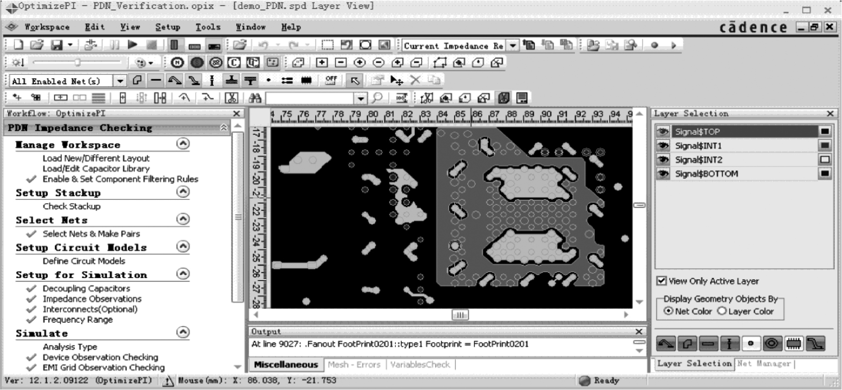 (7)OptimizePI是封装和PCB电源完整性分析及去耦电容优化设计工具,可用于给定目标阻抗情况下的最优成本优化,以及给定电容类型情况下的最佳性能优化,其图形工作界面如图2-63所示。