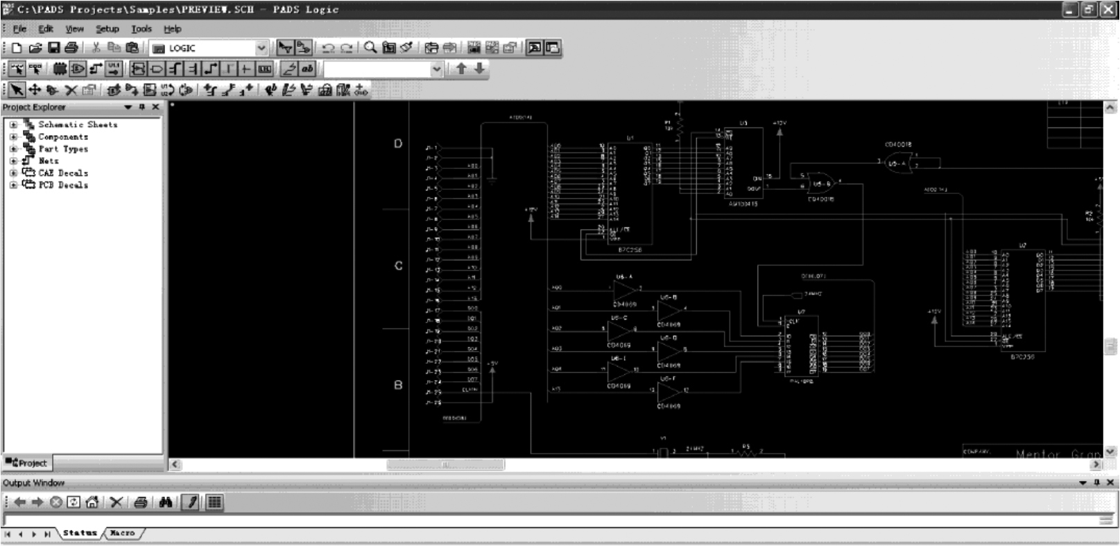 PADS Logic(其原理图输入界面如图2-67所示)是PADS系列软件的原理图输入工具,是一个界面友好、操作简单、功能齐全的原理图设计环境。PADS Logic提供元器件库的管理、多页/层次式原理图设计、元器件与网络的浏览与检索、BOM输出和网表输出等一系列常规原理图设计功能。