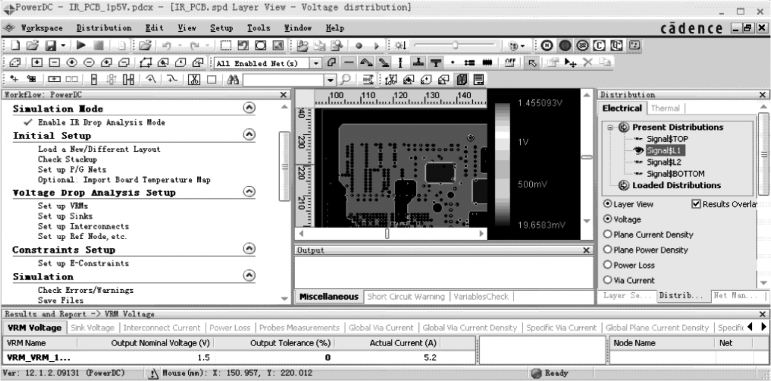 (3)PowerDC是高效准确的直流分析工具,可用于IC封装或PCB整板的直流压降分析、电流密度分析和过孔电流的分析,还可以进行电热协同分析,当VRM模块有Sense感应线时,还可以进行感应线位置的优化,在设计完成后,可以进行直流DRC检查,其图形工作界面如图2-62所示。