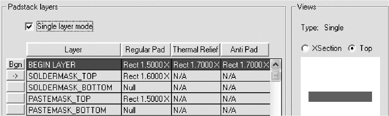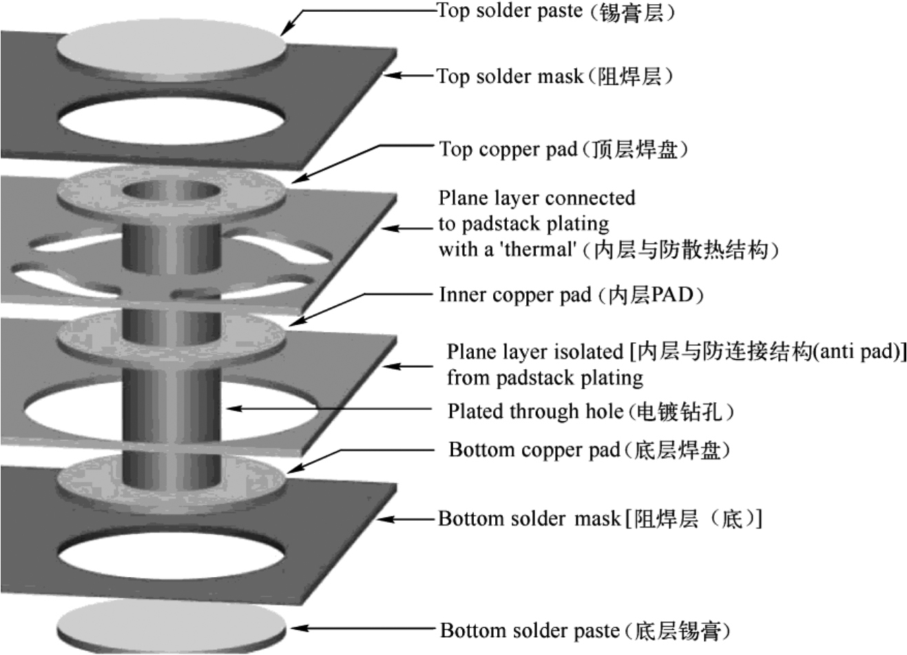 元器件真实物理封装的主要构成分为焊盘引脚(引脚编号与原理图逻辑符号的引脚编号一一对应)、封装的编号(与原理图的编号是对应的)、封装的框体丝印信息(一般与IC的外壳大小一致)、封装的装配信息。焊盘引脚是物理封装中最复杂的部分,SMD贴片类的焊盘引脚由TOP阻焊层(Soldermask_TOP)、TOP层焊盘和TOP加焊层(Pastemask_TOP)组成,SMD焊盘的结构如图2-54所示;PTH通孔类的焊盘引脚由TOP阻焊层(Soldermask_TOP)、TOP层焊盘、TOP加焊层(Pastemask_TOP)、BOTTOM阻焊层(Soldermask_BOTTOM)、BOTTOM层焊盘、BOTTOM加焊层(Pastemask_BOTTOM)及对应的钻孔数据构成(在出Gerber图纸时,如果PCB的各个层面为负片特性,则在通孔类焊盘建模时还需要添加Thermal Relief散热焊盘和Anti Pad隔离焊盘),PTH通孔类焊盘的叠层结构如图2-55所示。