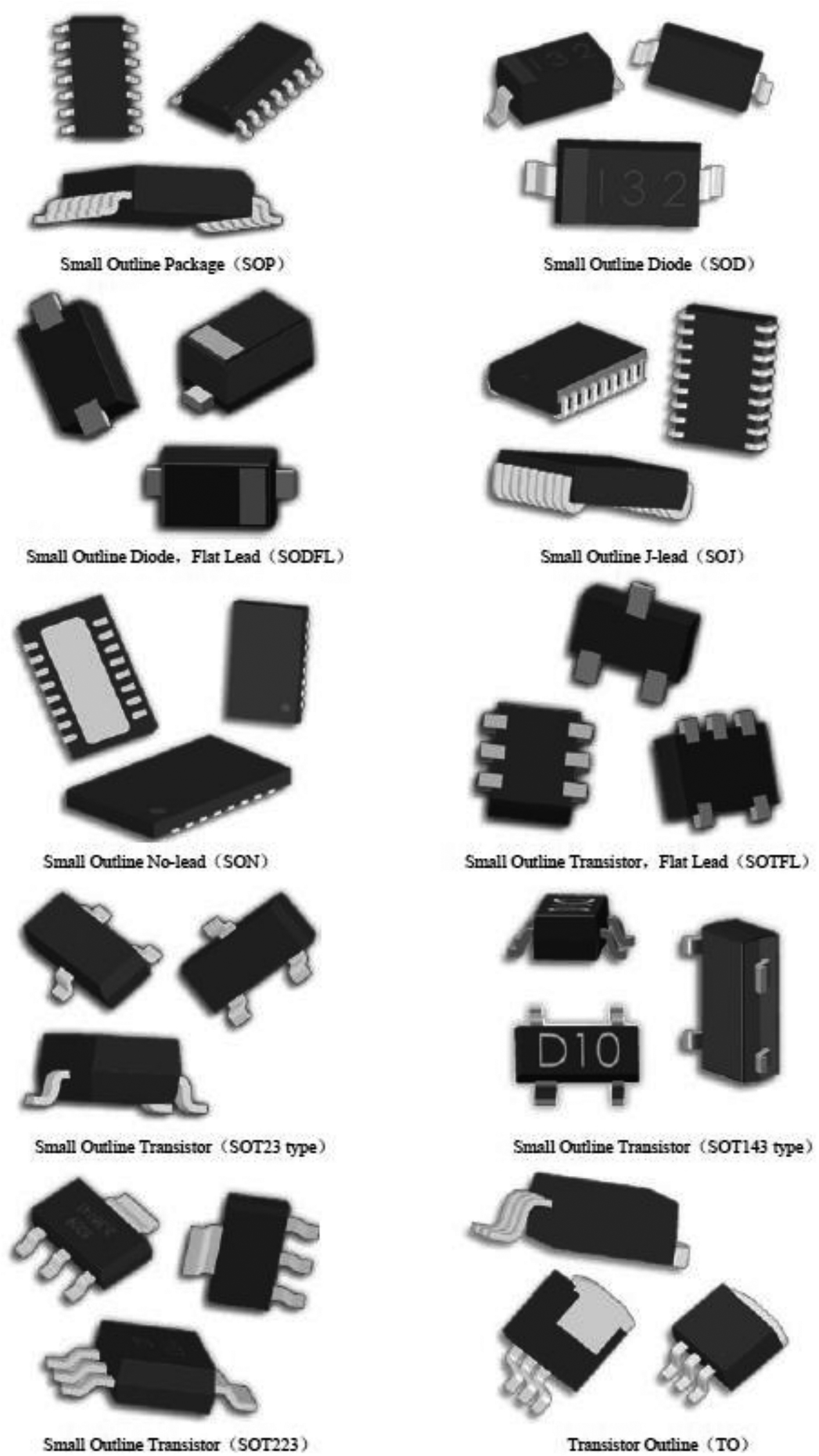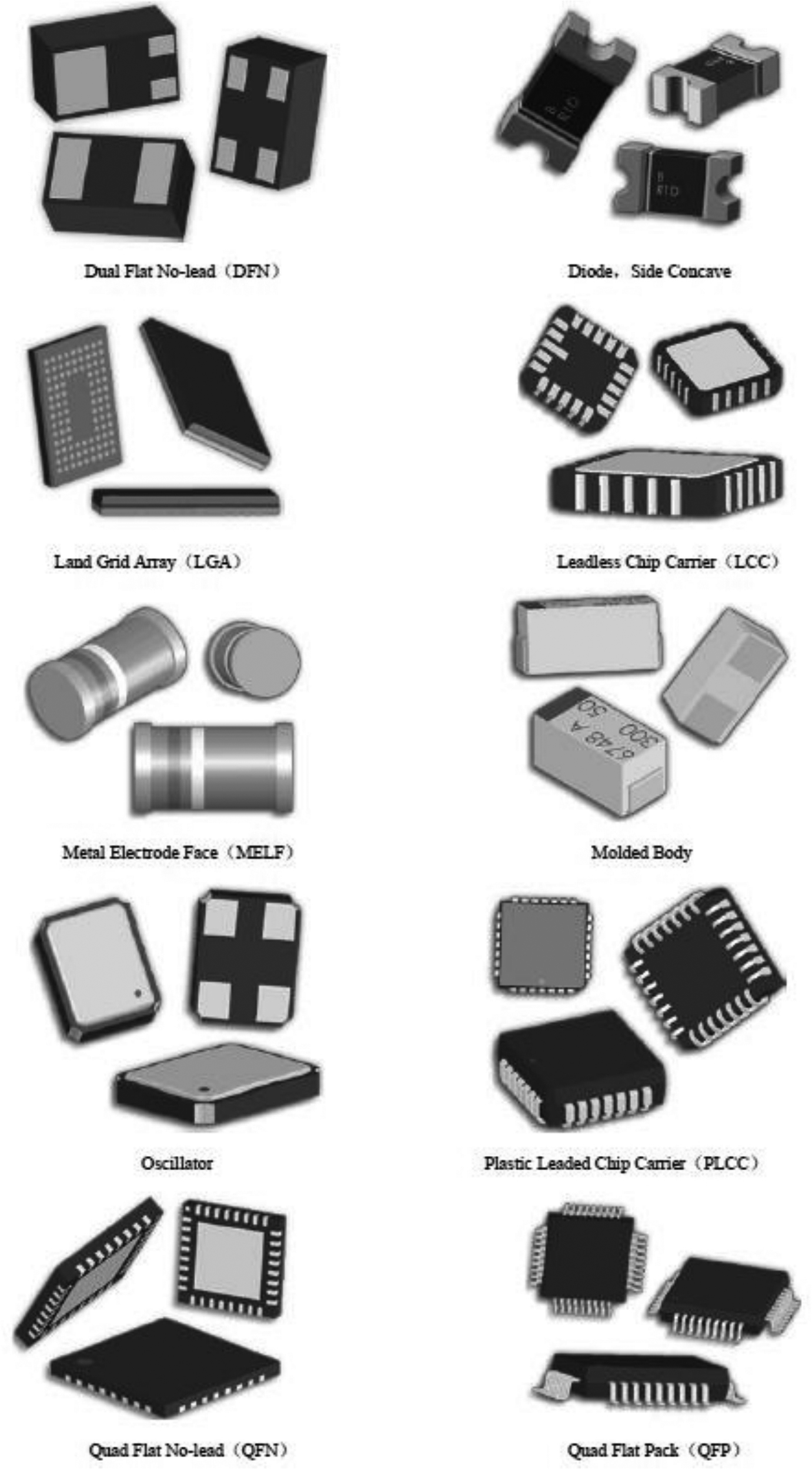 (1)SMD Calculator可以计算的封装包括Aluminum Electrolytic Capacitor、Ball Grid Array(BGA)、Ceramic Flat Pack(CEP)、Column Grid Array(CGA)、Ceramic Quad Flat Pack(CQFP)、Chip、Chip Array、Crystal、Dual Flat No-lead(DFN)、Diode,Side Concave、Land Grid Array(LGA)、Leadless Chip Carrier(LCC)、Metal Electrode Face(MELF)、Molded Body、Oscillator、Plastic Leaded Chip Carrier(PLCC)、Quad Flat No-lead(QFN)、Quad Flat Pack(QFP)、Small Outline Package(SOP)、Small Outline Diode(SOD)、Small Outline Diode,Flat Lead(SODFL)、Small Outline J-lead(SOJ)、Small Outline No-lead(SON)、Small Outline Transistor、Flat Lead(SOTFL)、Small Outline Transistor(SOT23 type)、Small Outline Transistor(SOT143 type)、Small Outline Transistor(SOT223)和Transistor Outline(TO)。封装样式如图2-73所示。