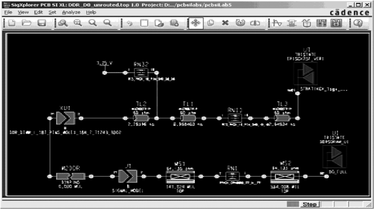 (7)PCB SI:提供了一个高速集成的高速设计与分析环境,可提取信号网络的拓扑结构,并根据仿真信号的结果优化分析拓扑结构;可分析信号完整性分析中信号的反射和串扰等,找出信号走线上的阻抗不连续点;可分析相邻网络信号的crosstalk,从而避免因串扰引起的干扰(信号的干扰会包含多次谐波);结合Cadence自身的PI工具可以进行电源平面目标阻抗的分析,进行去耦电容的位置、数量、种类的合理搭配。基于Cadence的PCB SI分析工具,可以进行约束驱动布局、约束驱动布线及布线后的物理检查与电气仿真的检查,其拓扑提取分析界面如图2-59所示。