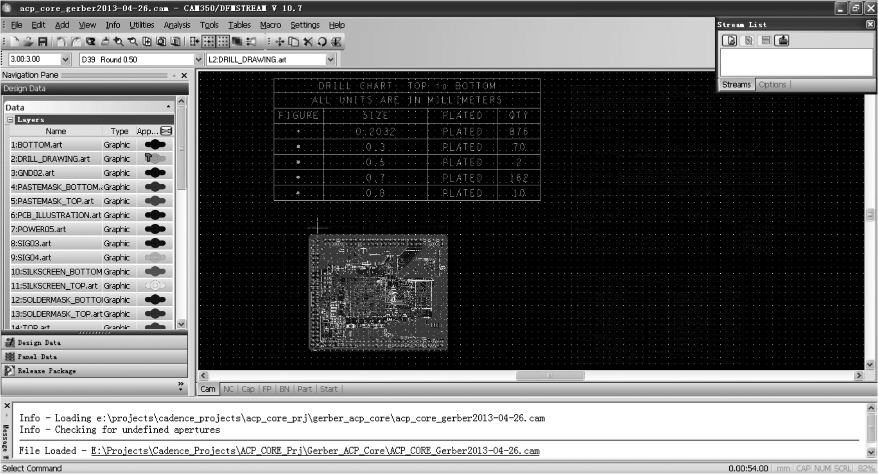 CAM350图形工作界面如图2-78所示。一般在完成PCB的Gerber图纸输出后,需要逐一检查TOP层电气走线层、BOTTOM层电气走线层、内层的电气走线层、内层的电源层、内层的地层、顶层的丝印层(SILKSCREEN_TOP)、底层的丝印层(SILKSCREEN_ BOTTOM)、顶层的阻焊层(SOLDERMASK_TOP)、底层的阻焊层(SOLDERMASK_ BOTTOM)、顶层的加焊层(PASTEMASK_TOP)、底层的加焊层(PASTEMASK_ BOTTOM)、钻孔数据(Drill和rou数据)和钻孔表与钻孔图等。