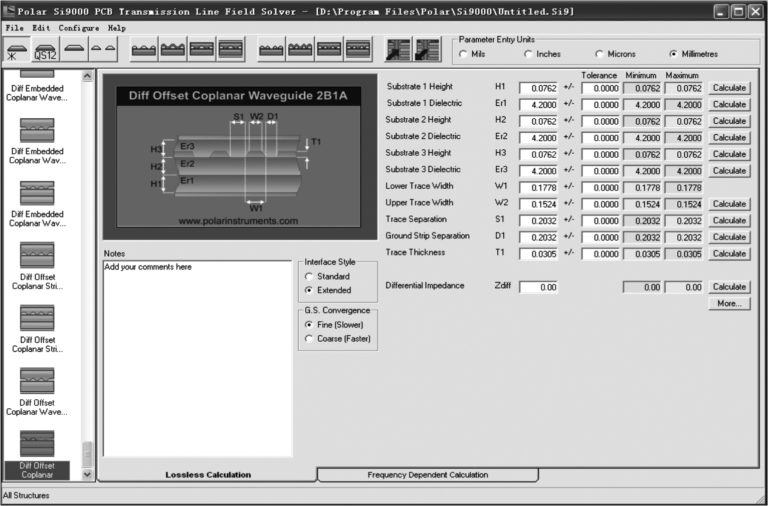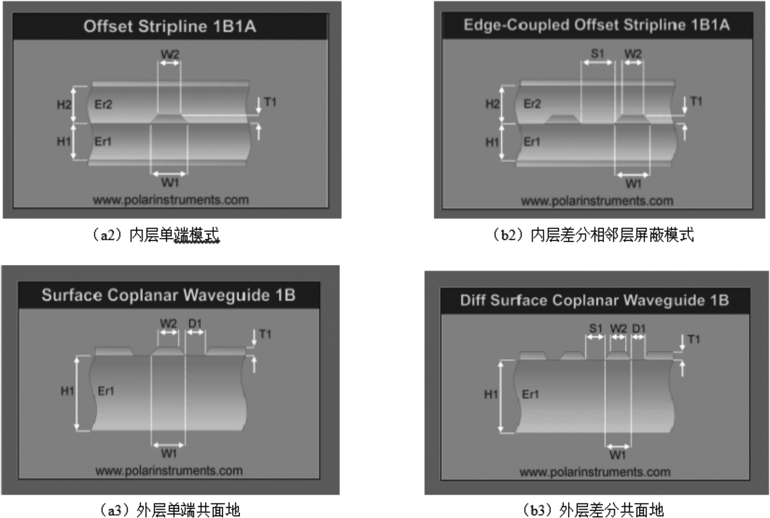 Polar Si9000工作界面如图2-79所示,设计中常用的6种阻抗计算模式分别为Surface Microstrip1B(外层单端无阻焊模式)、Offset Stripline 1B1A(内层单端模式)、Edge-Coupled Surface Microstrip1B(外层差分无阻焊模式)、 Edge-Coupled Offset Stripline 1B1A(内层差分相邻层屏蔽模式)、Surface Coplanar Waveguide 1B(外层单端共面地)和Diff Surface Coplanar Waveguide 1B(外层差分共面地),如图2-80所示。