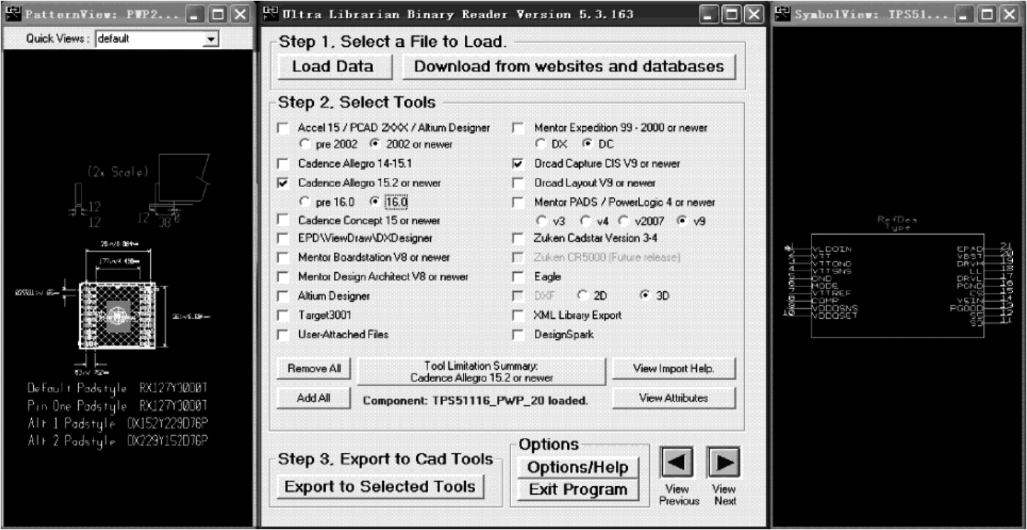 在使用时,只需要在网址输入IC的名称TPS51116,就可以找到对应的文件TPS51116_PWP_20.bxl,将TPS51116_PWP_20.bxl导入Ultra Libration,如图2-71所示,左边是生成的PCB Footprint,右边是将要生成的原理图Symbol,单击“Export to Selected Tools”按钮即可生成相应的封装。
