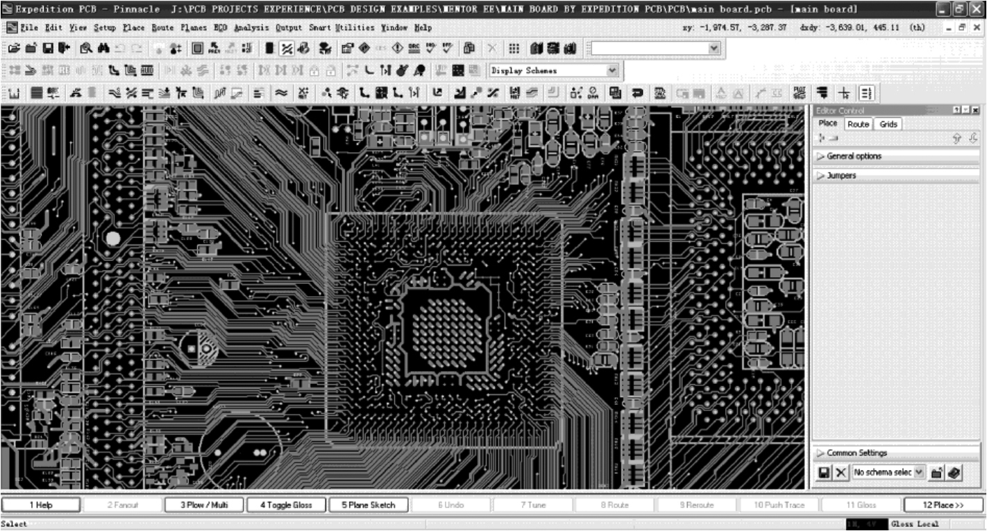Expedition PCB(其图形工作界面如图2-66所示)为设计师提供了一整套用于复杂PCB物理设计、分析和加工的可伸缩的工具,它将交互设计和自动布线有机地整合到了一个设计环境中。设计师可以定义所有设计规则,包括高速布线约束、创建板型、布局、交互布线和自动布线,直到加工文件生成。Expedition PCB没有任何设计规模的限制,没有层的限制、器件数量、网线数量和引脚数的限制,提供给设计师最大的设计空间。Expedition PCB的核心—获业界大奖的Auto Active自动布线器是基于形状的无网格布线器,布线速度极快,布线的可加工性首屈一指。它实现了真正的45°布线,并完全支持当今的各种复杂封装,如BGA、CSP、COB和微过孔、埋孔、盲孔等加工工艺。其器件放置后会推挤走线,走线会自动调整,大面积敷铜处理方法皆独一无二。与前端设计工具Design Capture、信号完整性分析工具有机结合,以及与标准DXF、IDF双向接口,Expedition PCB为电子设计师提供了复杂PCB设计的全线解决方案。