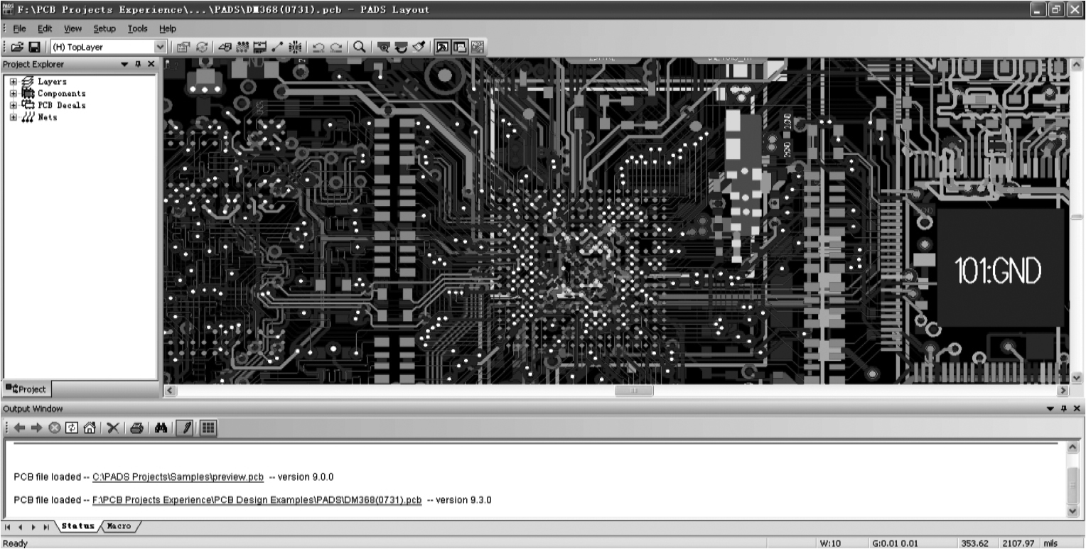 PADS Layout(其工作界面如图2-68所示)是一个复杂的高级PCB工具,是规则驱动的设计工具。PADS Layout是一个强有力的基于形状化和规则驱动的布局、布线工具,它采用自动和交互式的布线方法,以及先进的目标连接与嵌入自动化功能,有机地集成了前后端的设计工具,包括最终的测试、准备和生产制造过程。PADS Router是一个快速的交互式布线编辑器,它使用了功能强大的PADS Autorouter(BlazeRouter)算法,包括推挤、平滑布线、自动变线宽、焊盘入口质量和Plowing分等级的布线规则设置等。