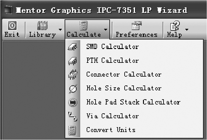 LPWizard目前在MentorGraphics PADS9.5中已经被集成为软件的一部分,它也可以单独安装使用。采用LPWizard同样可以生成符合IPC-7351标准的原理图Symbol封装和Footprint封装。LPWizard支持的封装计算内容包含(如图2-72所示)SMD Calculator、PTH Calculator、Connector Calculator、Hole Size Calculator、Hole Pad Stack Calculator、Via Calculator和Convert Units。