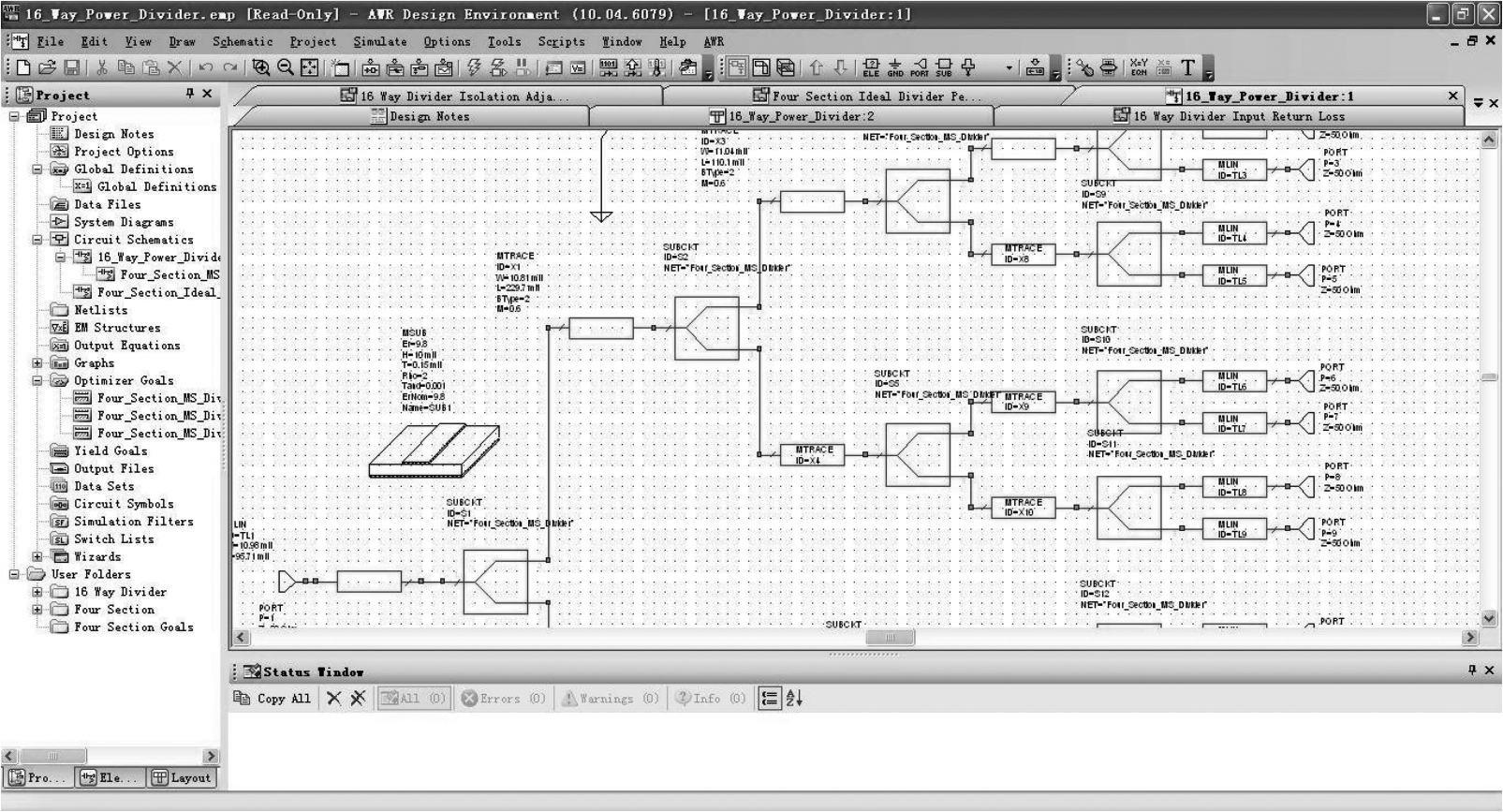AWR Design Environment中的Microwave Office软件(10.04版本的图形界面如图2-102所示)是一款与ADS类似的仿真软件,采用矩量法(Method of Momentum,MoM)。该软件是通过两个模拟器来对微波平面电路进行模拟和仿真的。对于由集总元件构成的电路,用电路的方法来处理较为简便。该软件设有VoltaireXL模拟器来处理集总元件构成的微波平面电路问题。而对于由具体的微带几何图形构成的分布参数微波平面电路则采用场的方法较为有效,该软件采用EMSight的模拟器来处理任何多层平面结构的三维电磁场问题。