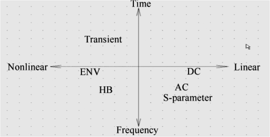 ADS Momentum基于矩量法实现对电磁场的求解,ADS EMDS基于有限元算法实现对电磁场的求解。ADS非常适合计算第三维度上均匀变化的结构,如多层PCB的设计、无源电路的设计和RFIC/MMIC等 [16] 。目前最新的版本是ADS2013.06,ADS可以与Cadence、Matlab、MentorGraphics和CST等软件进行协同仿真分析,基于ADS可以进行时域仿真分析、频域仿真分析、模拟电路仿真分析、数字电路仿真分析和非线性电路仿真分析,根据仿真的项目不同,具体可以分为直流(DC)仿真控制器、交流(AC)仿真控制器、S参数仿真控制器、谐波平衡(HB)仿真控制器、大信号 S 参数(LSSP)仿真控制器、增益压缩(XDB)仿真控制器、包络(ENVELOPE)仿真控制器和瞬态(TRANSIENT)仿真控制器。根据时域分析、频域分析、线性领域分析和非线性领域的角度,对各类分析进行拓扑归类,如图2-98所示。