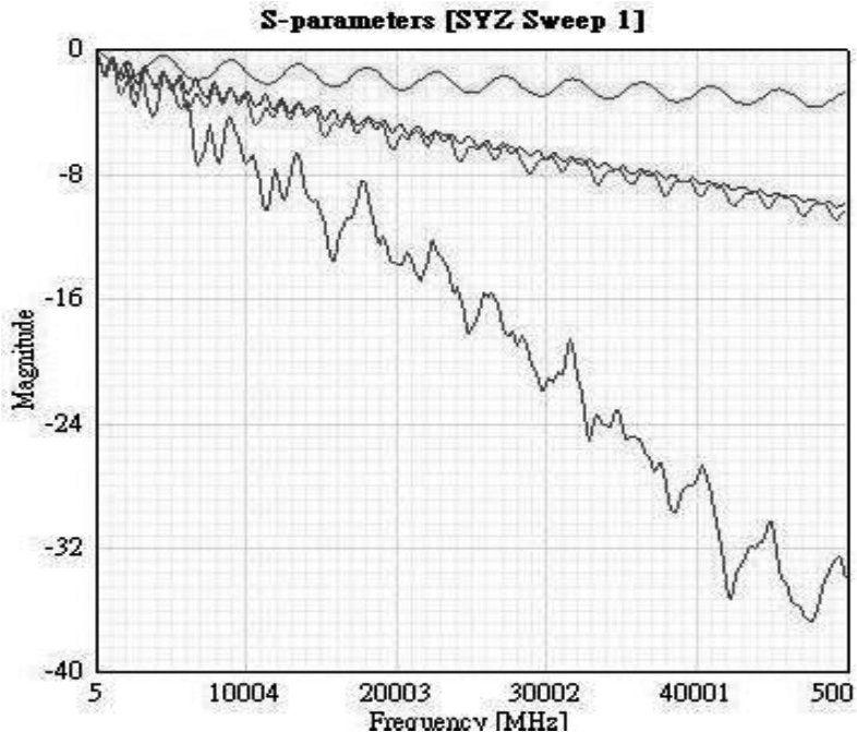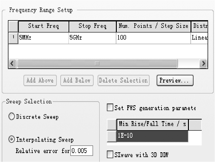 我们所要分析的信号都是由不同频率点的正弦波信号组成的,当正弦波信号到某个频点后,在PCB路径上进行传播时,会衰减得特别快。研究信号完整性的目的就是为了使设计的系统具有较强的鲁棒特性,具有较大的设计余量,当系统设计中出现问题时能够准确地定位问题所在。为了对信号进行分析,需要确定这个频点。通过IC Datasheet或对信号的实际测量可以得到信号的上升时间 T r (一般指10%~90%信号上升时间),从而得到信号的BW,明确了BW,就明确了要分析的信号的分析范围,在频域内就对应一个个的频点。在PCB设计之前,可以通过软件仿真进行S参数仿真分析,分析其中可能存在的问题。当确定了BW后,在该BW频带内进行S参数仿真频段设定如图3-6所示,S参数回波损耗如图3-7所示,从仿真结果可以看出,随着频率的增加,信号的衰减越来越严重。