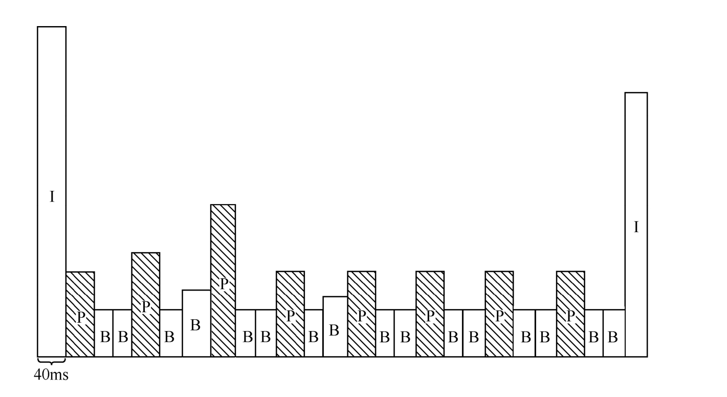 一帧就是一幅静止的画面,连续的帧就形成动画,如电影等。我们通常所说的帧数就是在1秒里传输的图片数,通常用fps(Frames Per Second)表示。每一帧都是静止的图像,快速连续地显示帧便形成了运动的假象。高帧率可以得到更流畅、更逼真的动画。每秒钟帧数(fps)愈多,所显示的动作就会愈流畅。一般来说,图像帧率设置为25fps已经足够,这时每帧的间隔大约是40ms(人眼观看影像时,会产生视觉延迟。人眼的视觉延迟感应时间为40ms,如果图像与图像之间的间隔小于40ms,人眼就会认为画面是流畅的)。帧分为I帧(采用帧内压缩算法,关键帧,可单独解码出图片)、P帧(帧间压缩,表示与前面帧的变化量,无法独立解码,需要参考其他帧解码)和B帧(双向预测帧间压缩,无法独立解码,需要参考其他帧解码),如图1-32所示。由于信息的压缩,代表相对于前一帧的变化量的P帧信息会有损失,所以通常每秒会生成一个I帧,以保证视频的还原效果。