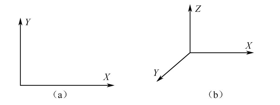 通常情况下,两轴同步联动时常用两个独立单轴组成平面直角坐标系,一个为X轴,另一个为Y轴,如图1-72(a)所示,三轴同步联动时组成空间直角坐标系,如图1-72(b)所示。