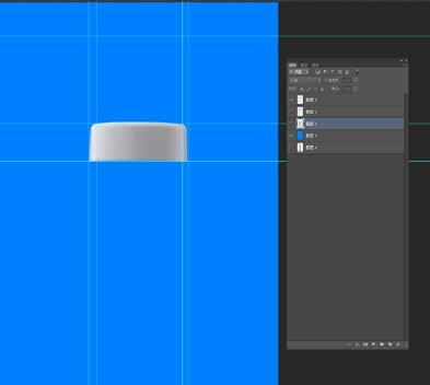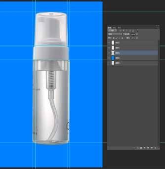 我们现在要校正瓶子的透视变形。首先得给瓶子拖出参考线。瓶身和瓶颈(图层2和图层3)的宽度相同,因此我们依次从瓶颈、瓶身的左右两边拖出两条竖向的外参考线,再从瓶盖的左右两侧拖出两条内参考线。